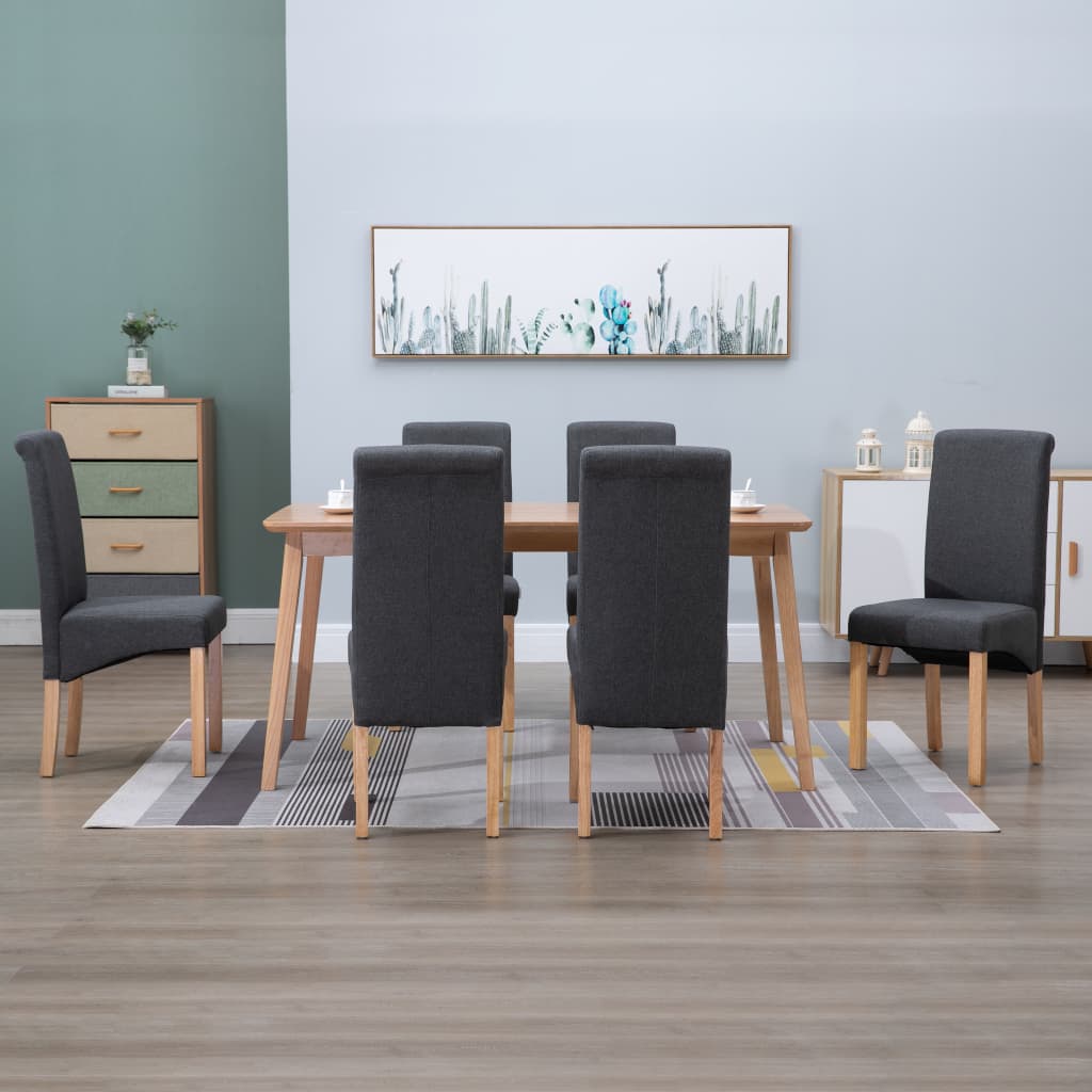 This set of 6 dining chairs, made from quality fabric, is aesthetically and ergonomically designed to make a cosy highlight in your home. It provides a comfortable place for your family to have dinner in the dining room or read and rest in the living room. Thanks to the padded seat and backrest, our chairs will surely bring you optimal seating comfort. The solid wooden frame also bring super stability and ensure the chairs excellent durability. Delivery includes 6 dining chairs.