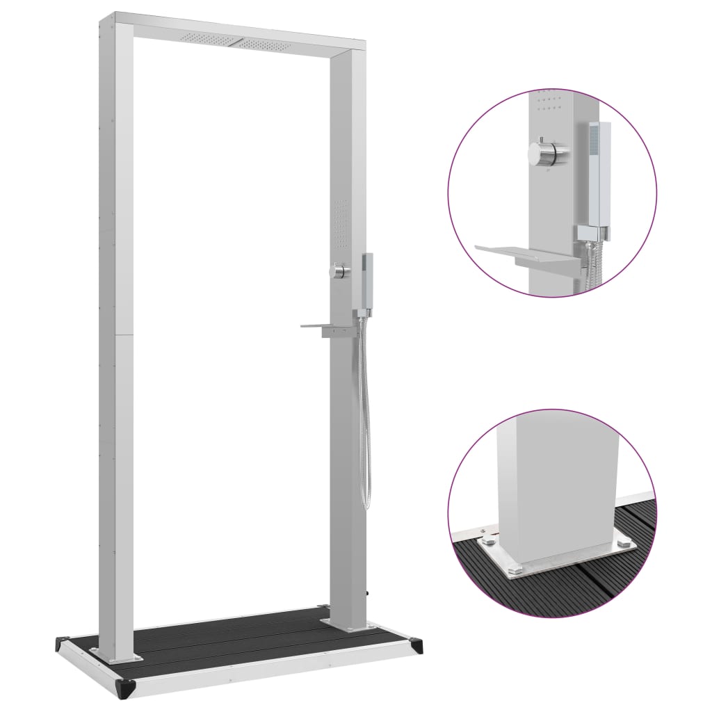 Our multifunctional shower panel system has a stylish design. Combined with sleek shower tray, it will make a great addition to your swimming pool and other outdoor living space. Standing out with spacious design, this outdoor shower is suitable for 2-person use at the same time. The shower tower is made of durable stainless steel with a brushed finish and has a beautiful, curved design. It has 2 rainfalls, a waterfall, 2 massage jets and a handheld shower head, which can be easily selected by means of a knob. Immerse yourself in a truly relaxing shower experience and enjoy the modern style of this beautifully designed shower panel system! Our shower base offers the highest level of hygiene protection, featuring durability and corrosion-resistance. The garden shower tray is easy to clean with just a damp cloth. Additionally, the fixing holes are predrilled for easy installation. The shower panel system is easy to assemble. Mounting accessories are also included in the delivery.