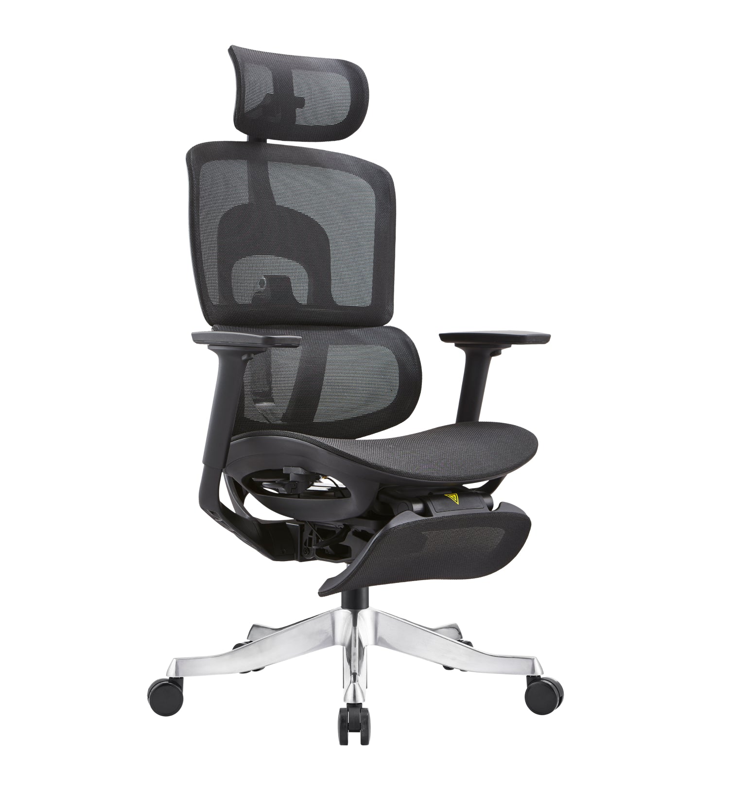 Skyland Ergonomic Office Chair features dynamic backrest, adjustable headrest, seat depth sliding, and plush 3D armrests. The high-back design offers breathable mesh for efficient air circulation. Synchro reclining mechanism allows for easy changes of position. The chair is supported by a solid aluminum 360-degree swivel base.